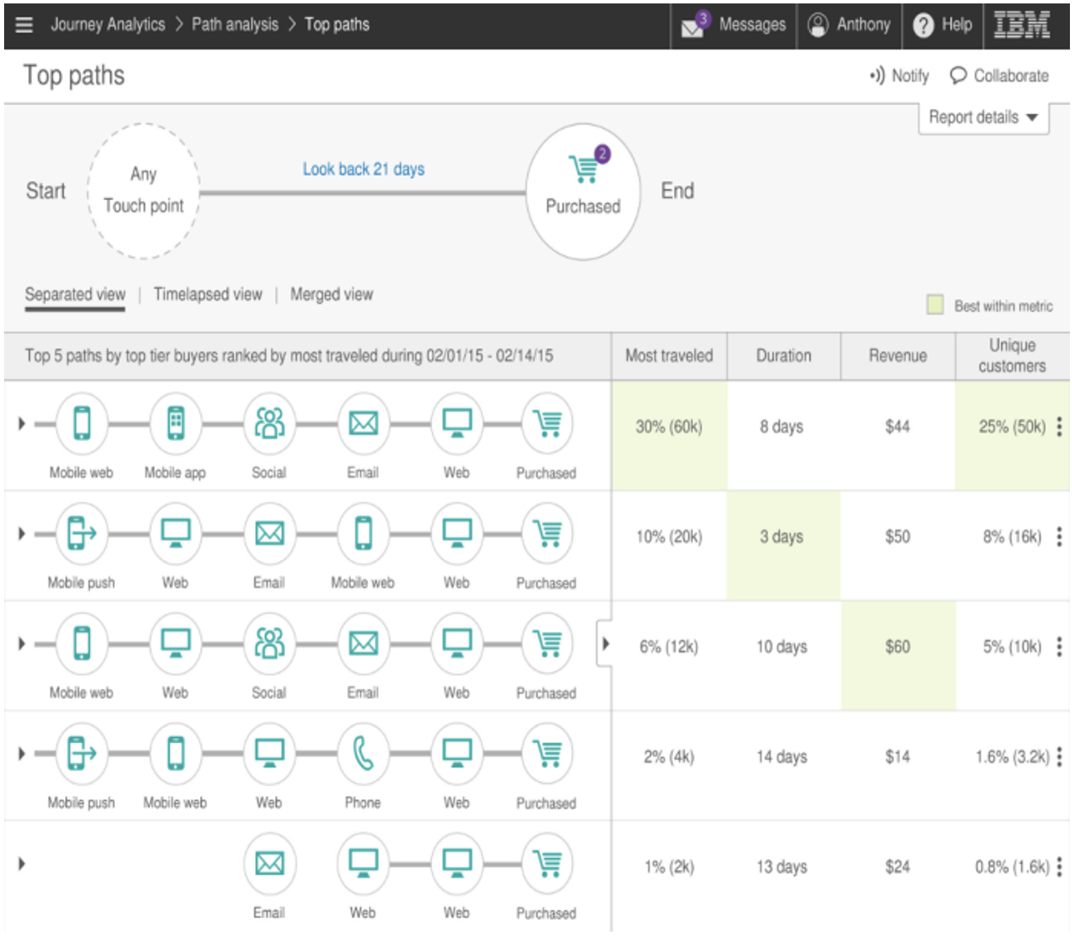 IBM Journey Analytics will enable you to gain the insights necessary to thoughtfully and smartly interact with your customers, so that they receive a high-quality, consistent experience across all channels, at all times. The solution allows you to study the top paths customers travel in a variety of ways, including the most traveled paths, the shortest paths and the paths generating the most revenue. By studying these top journeys and working with your customer experience design team, you can purposefully design experiences to accomplish specific business goals.